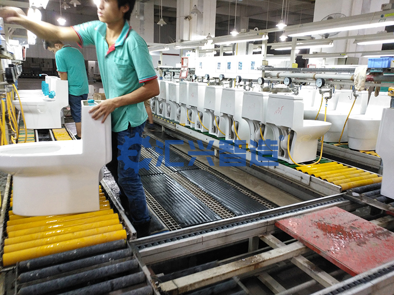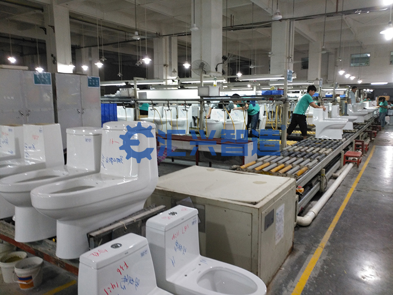 因為連體馬桶比較重,適合選擇做自動組裝線輸送,必須要做單層工裝板或許上下層旋轉(zhuǎn)工裝板。其線體用高強(qiáng)度鋁型材制作,工裝板輸送鏈采用BS30-C212A三倍速鏈條,動力采用變頻調(diào)速,阻擋器采用氣缸自動阻擋。