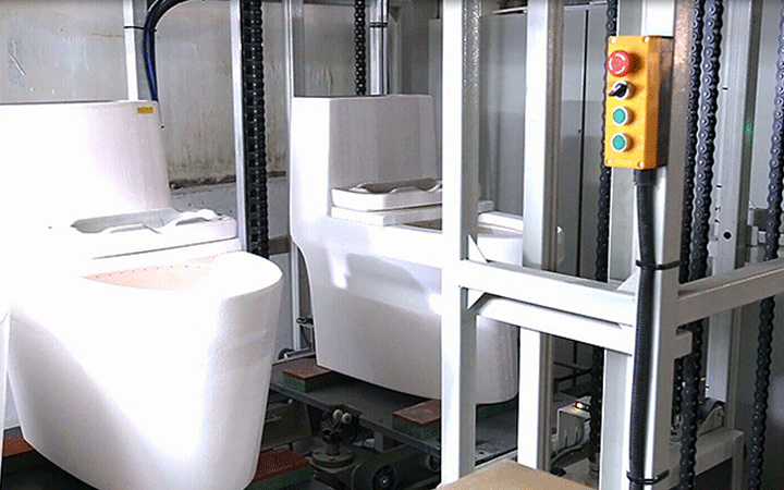 釉坯通過自動(dòng)輸送線、升降機(jī)、頂升平移機(jī)進(jìn)行成瓷儲(chǔ)存、檢測外觀和測漏、水件安裝、分級(jí)試水等各項(xiàng)工序均為線上操作。馬桶測漏采用真空測漏器進(jìn)行真空檢測產(chǎn)品是否漏氣,從而判斷是否漏水;采用觸摸控制系統(tǒng)可記錄產(chǎn)品的合格數(shù)量及合格率。馬桶測試線優(yōu)化各個(gè)工序的人員分配,節(jié)約了空間,提高了各個(gè)工序人工效率。