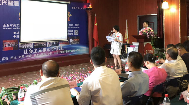 2017年9月28日,廣東匯興精工智造股份有限公司(股票代碼:839258)在匯興學(xué)校召開9月份月度大會及重要簽約儀式。董事長鐘輝,辛主任,東莞證券郭副總裁一行,大信會計事務(wù)所肖所長一行,華商律師所姜先生一行,中國銀行大嶺山支行葉行長,建設(shè)銀行大嶺山支行陳行長,東實集團潘經(jīng)理等一系列特別嘉賓及匯興智造各分子公司代表參加此次大會。人資行政部經(jīng)理袁侃主持本次會議。