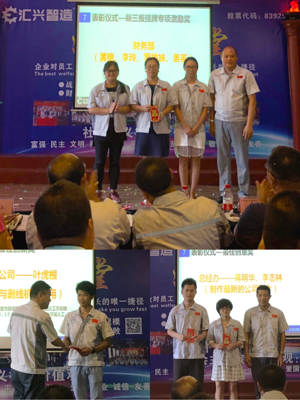 隨后舉行新員工入職歡迎儀式,每個月份都會有各個領(lǐng)域的人才加入?yún)R興智造這個大家庭,企業(yè)的快速發(fā)展需要更多的人才輸入,堅信在匯興智造,定能營造愈加廣闊的舞臺,各位新老員工在這里都能遇見最美麗的自己。同時對公司有重大貢獻的各位同事進行頒獎儀式,包括新三板掛牌專項激勵獎、最佳創(chuàng)新獎、好點子獎、新聞撰寫?yīng)?、人才推薦獎、最佳創(chuàng)意獎。