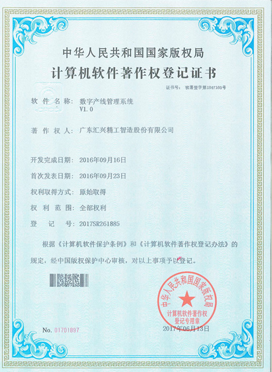 近日,匯興智造喜報(bào)頻傳,繼之前獲得多項(xiàng)發(fā)明專利和商標(biāo)注冊(cè)之后,又參與國(guó)家標(biāo)準(zhǔn)的起草,如今再次獲得五項(xiàng)國(guó)家版權(quán)局計(jì)算機(jī)軟件著作權(quán)登記證書,它們分別是產(chǎn)品數(shù)字化追溯系統(tǒng)、車間生產(chǎn)工藝參數(shù)監(jiān)控系統(tǒng)、車間生產(chǎn)設(shè)備維護(hù)管理系統(tǒng)、生產(chǎn)績(jī)效考核管理系統(tǒng)和數(shù)字產(chǎn)線管理系統(tǒng)這五大軟件。匯興智造17年來(lái),精工制造各類智能自動(dòng)化生產(chǎn)線,擁有行業(yè)深厚的經(jīng)驗(yàn),在充分了解客戶的實(shí)際需求后,開(kāi)發(fā)了產(chǎn)品數(shù)字化追溯系統(tǒng)等軟件,并取得相關(guān)著作權(quán)。其中,權(quán)利取得方式為原始取得,權(quán)利范圍為全部權(quán)利。