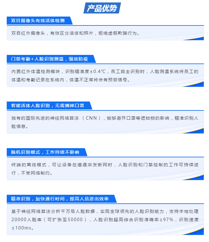 用國際先進(jìn)的神經(jīng)網(wǎng)絡(luò)算法 (CNN), 是經(jīng)數(shù)千萬次的算法訓(xùn)練后形成的產(chǎn)品,其集圖像采集、人臉檢測、人臉跟蹤和人臉比對(duì)等功能,不僅識(shí)別率高,同時(shí)識(shí)別速度快。值得一提的是,這款設(shè)備可以輕松識(shí)別出戴口罩的人臉信息,非常適合作為此次疫情防控的有力工具。