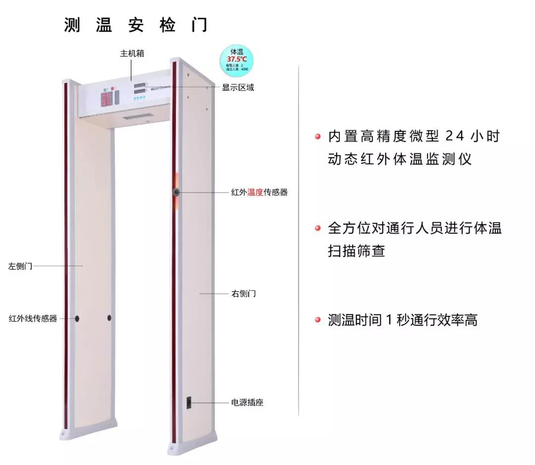匯興智造人體測溫安檢門將集紅外測溫和金屬檢測為一體化,可對(duì)通過安檢門的人員進(jìn)行溫度測試,如若超過安全溫度閾值將聯(lián)動(dòng)安檢門聲光報(bào)警,有效對(duì)人員進(jìn)行篩查并建立首道防線。