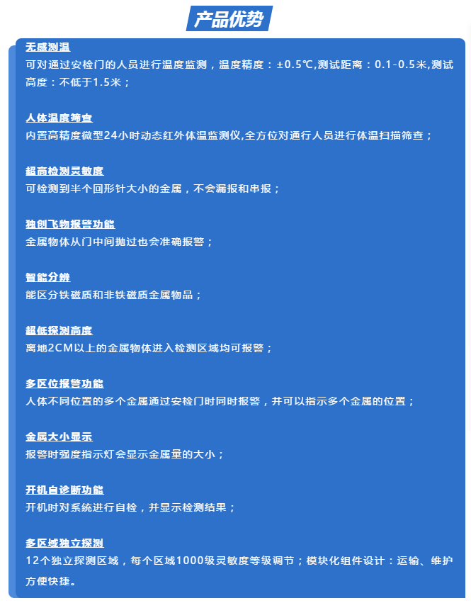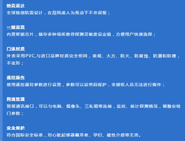 該設(shè)備采用世界先進(jìn)的電磁兼容設(shè)計(jì)和抗震動(dòng)設(shè)計(jì),具有超高靈敏度、極強(qiáng)的抗干擾能力和抗震能力,適用于管制刀具和槍支等危險(xiǎn)物品的安全檢查,廣泛應(yīng)用于監(jiān)獄、法院、學(xué)校、醫(yī)院、電子企業(yè)、港口、客運(yùn)站、展覽會(huì)館、會(huì)議中心、重大慶典、演唱會(huì)等重要場所。